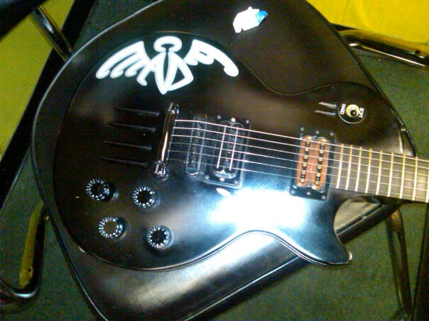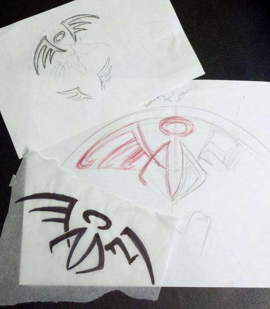 The first sketches, including tracing of the guitar body (middle) it was designed for. Being that this was for a specific guitar I made sure that the curve of the “wings” matched the curve of the body of the guitar so it would fit and flow correctly. After I was done sketching, he paid me for my time and we all sat and chatted about how happy we were with the concept.